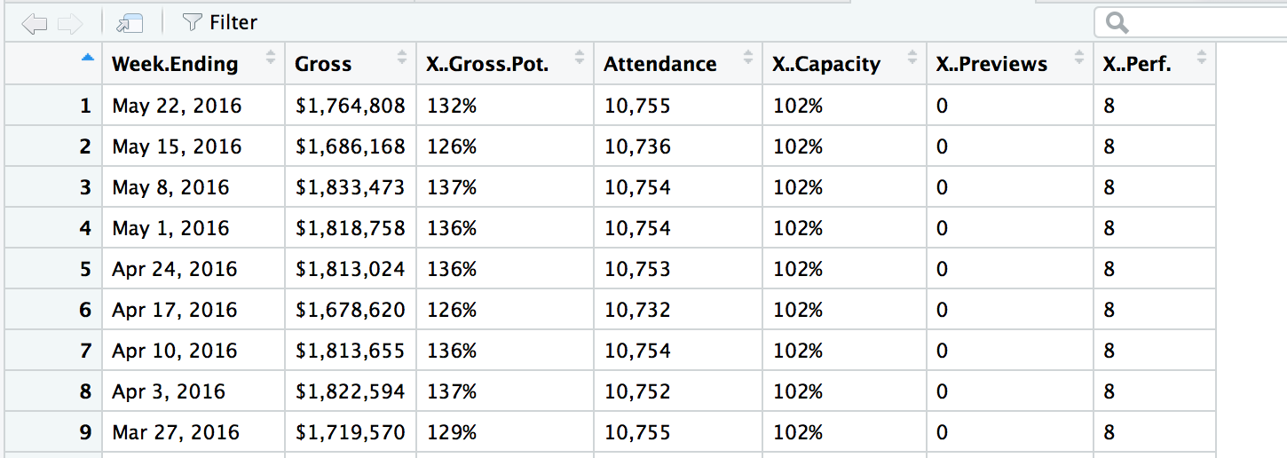 ~Week.Ending, ~Gross, ~X..Gross.Pot., ~Attendance, ~X..Capacity, ~X..Previews, ~X..Perf.,