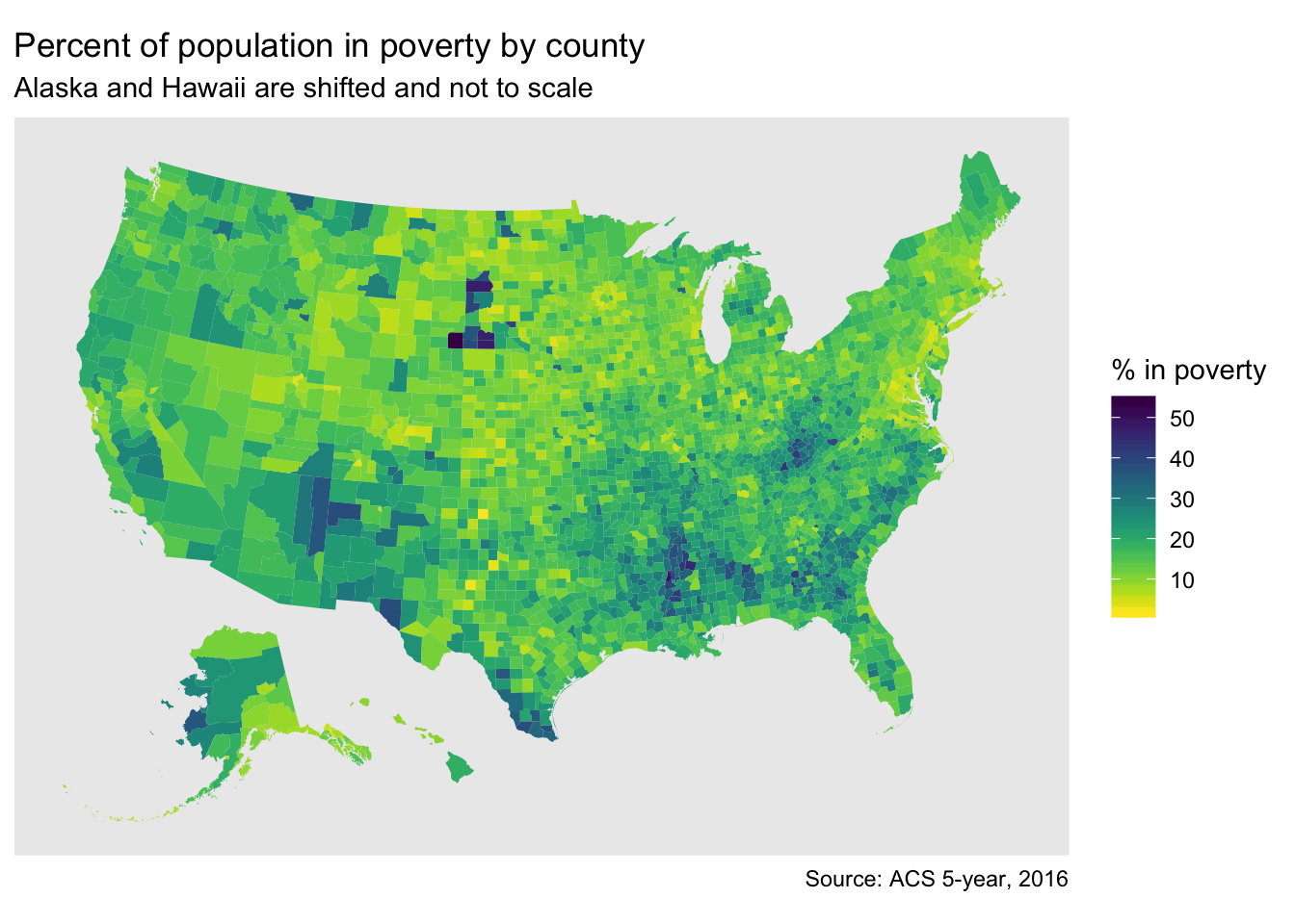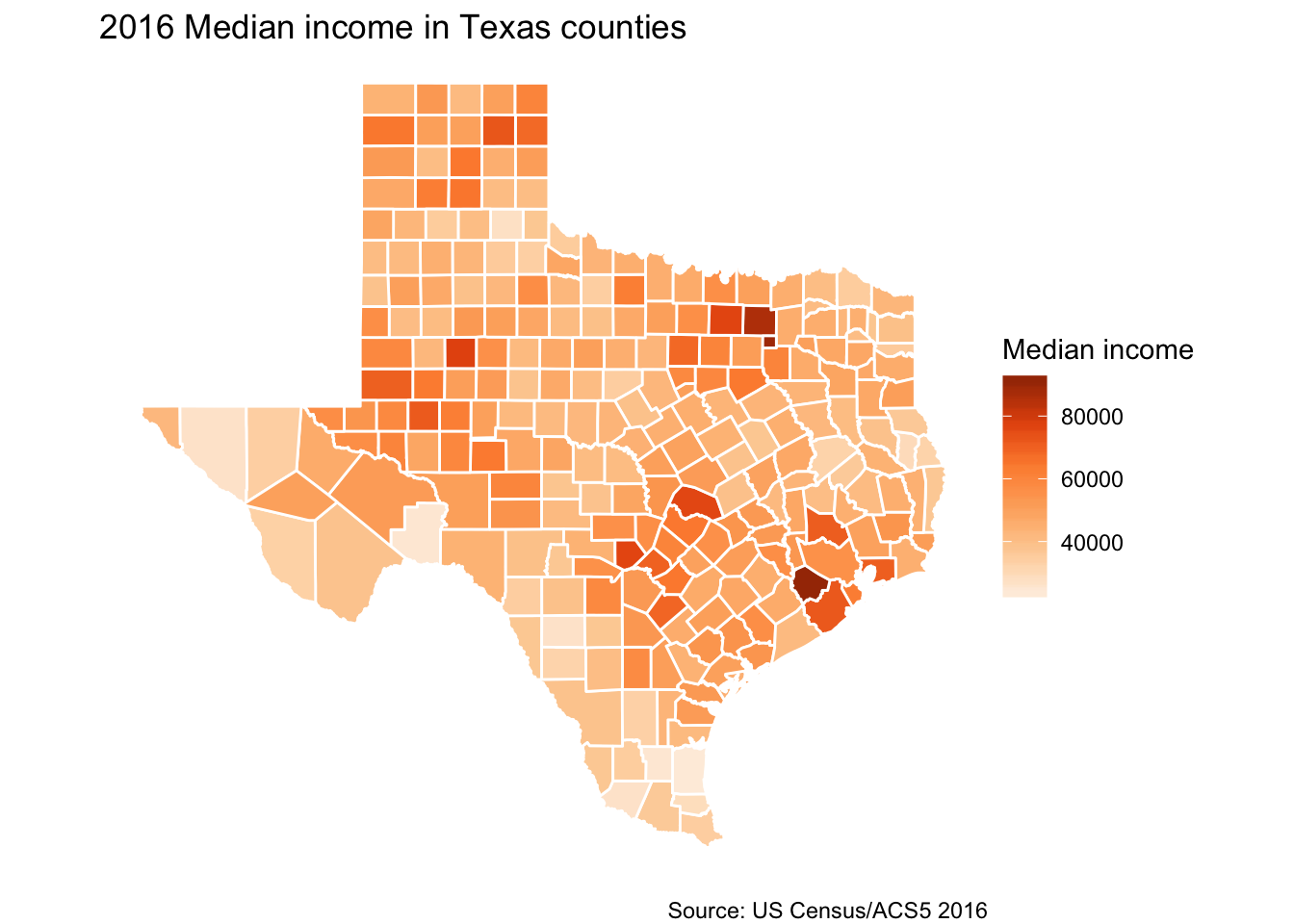 labs(title="2016 Median income in Texas counties", caption="Source: US Census/ACS5 2016")