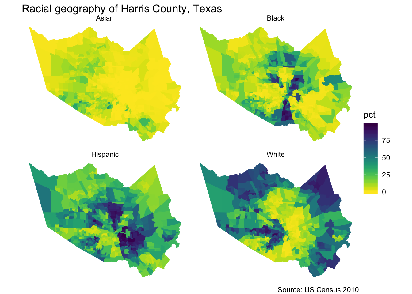 labs(title="Racial geography of Harris County, Texas", caption="Source: US Census 2010")