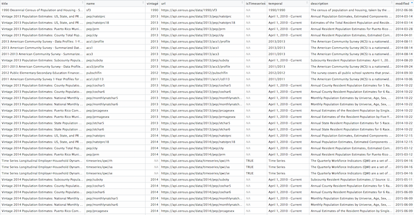 It takes quite a few minutes to download the list of this data set (23,000 rows!) but once you get it, you can explore it to see what sort of data you might like to download. You can also refer to the Census for some guidance.