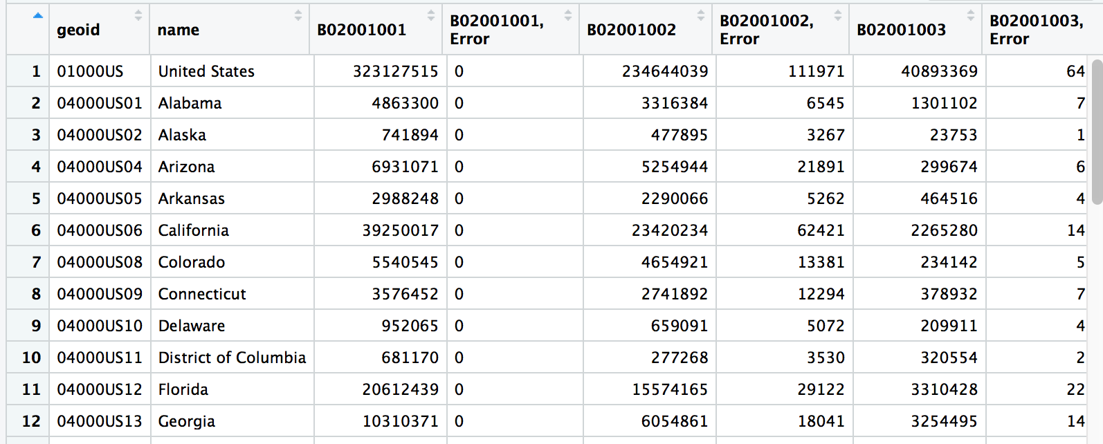## [10] "geoid" "B02001001" "B02001001, Error"