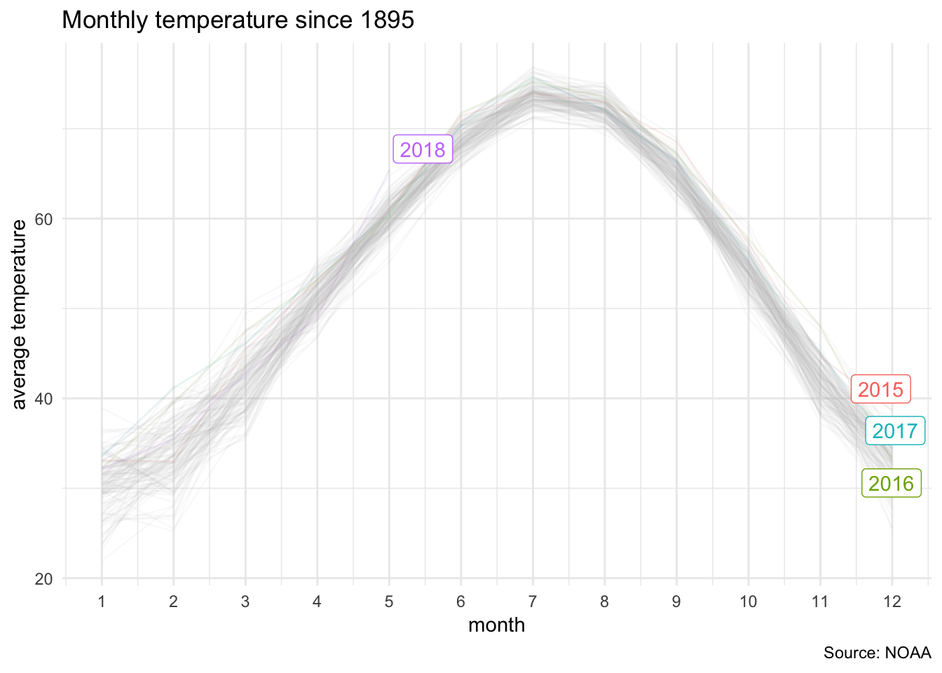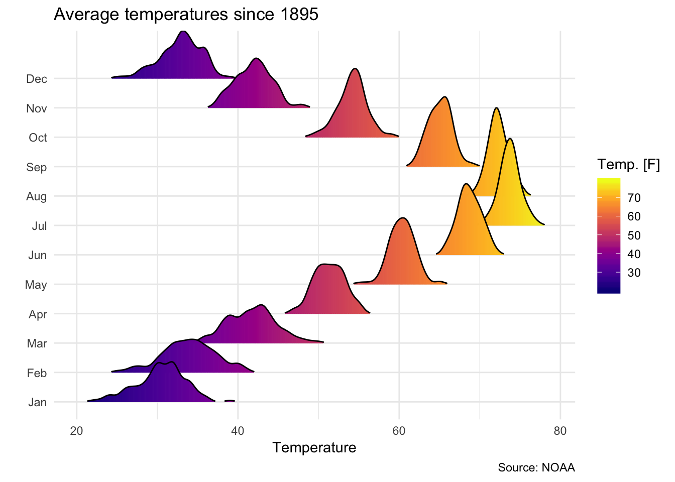 labs(title="Average temperatures since 1895", y="", x="Temperature", caption="Source: NOAA") +