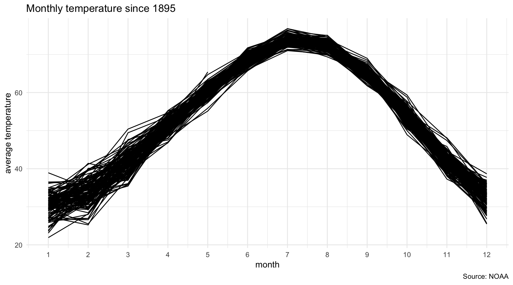 labs(y="average temperature", title="Monthly temperature since 1895", caption="Source: NOAA") +