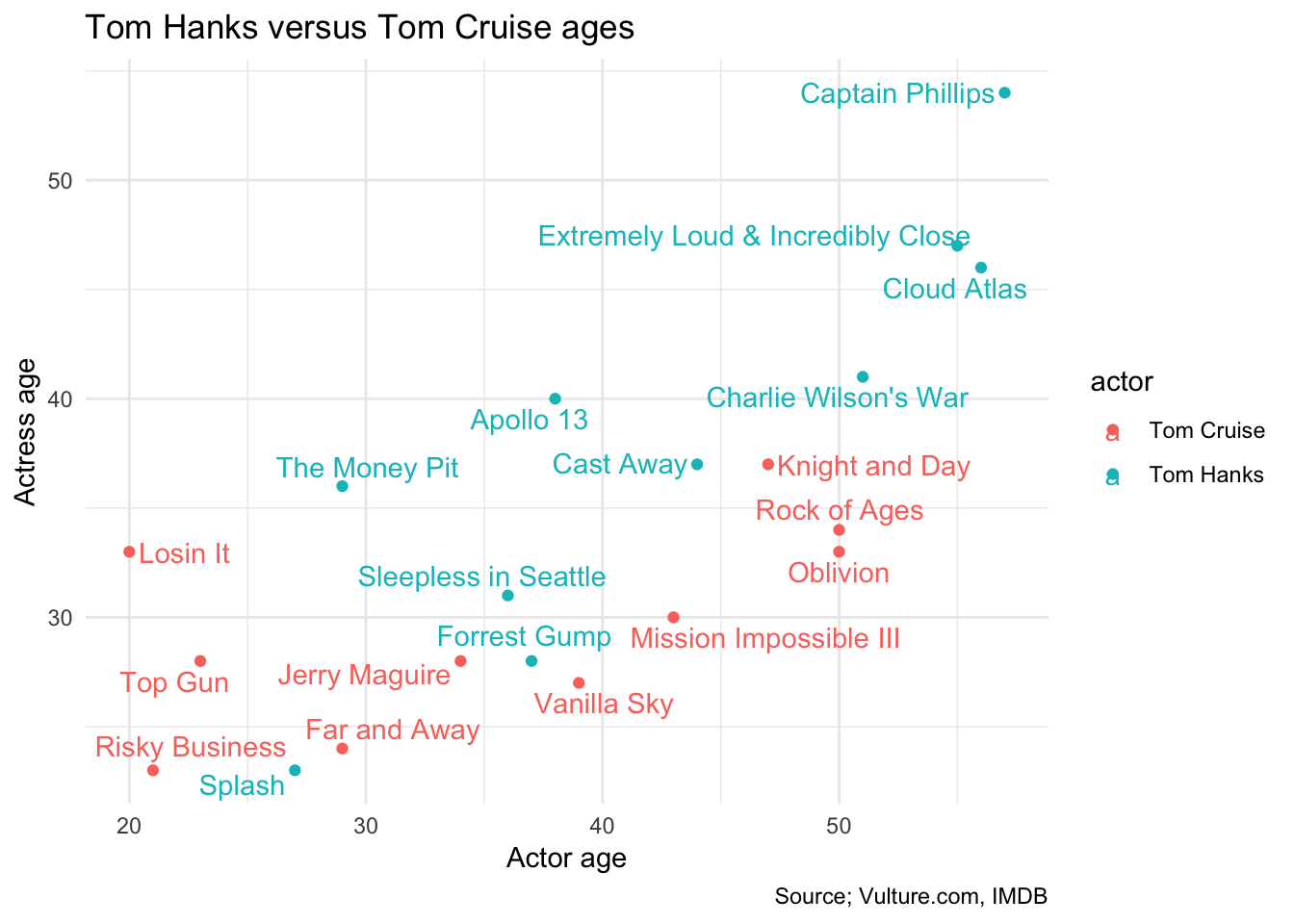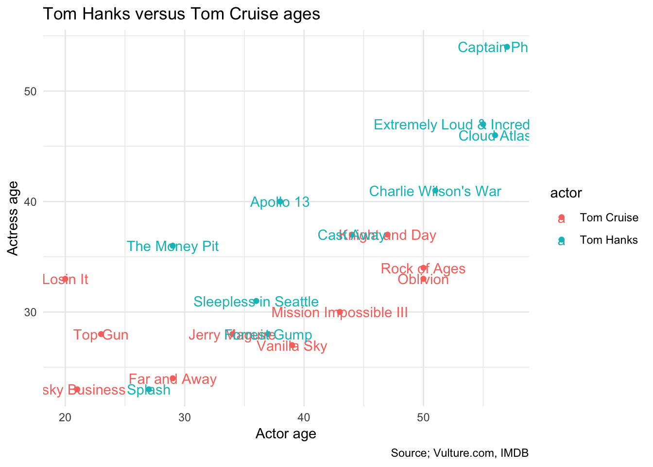 labs(y="Actress age", x="Actor age", title="Tom Hanks versus Tom Cruise ages", caption="Source; Vulture.com, IMDB") +