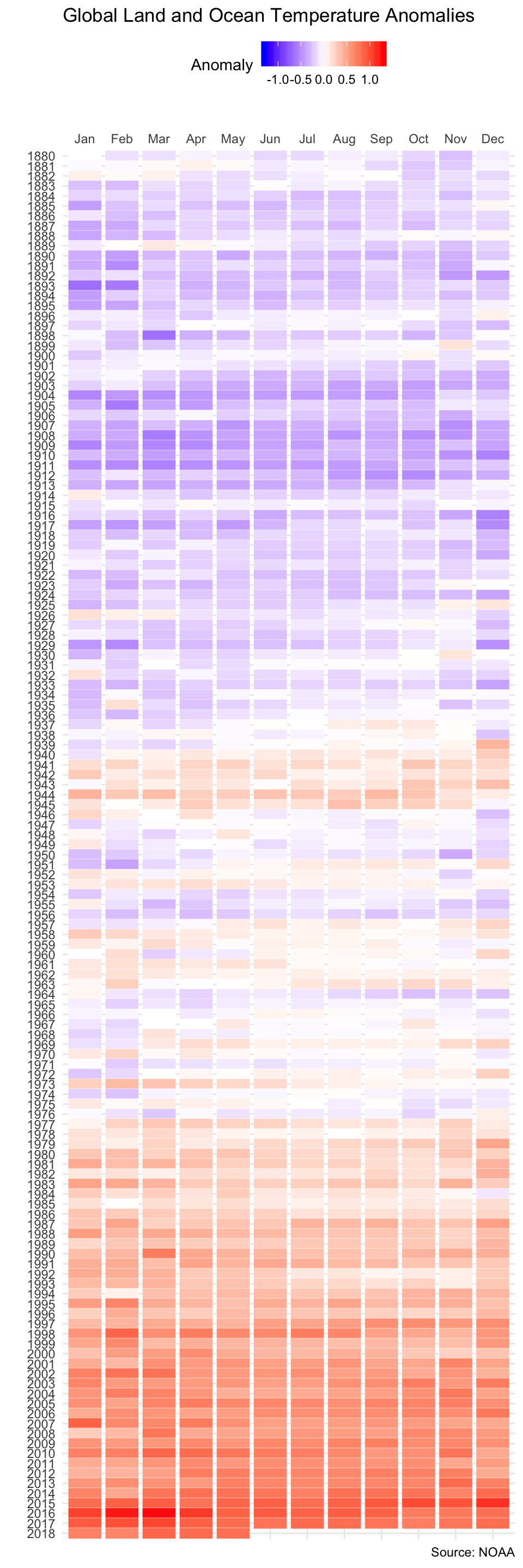 You can make some interesting charts with geom_tile() and it’s already part of ggplot2, no extension needed. Let’s use Global Land and Ocean Temperature Anomalies with respect to the 20th century average since 1880.
