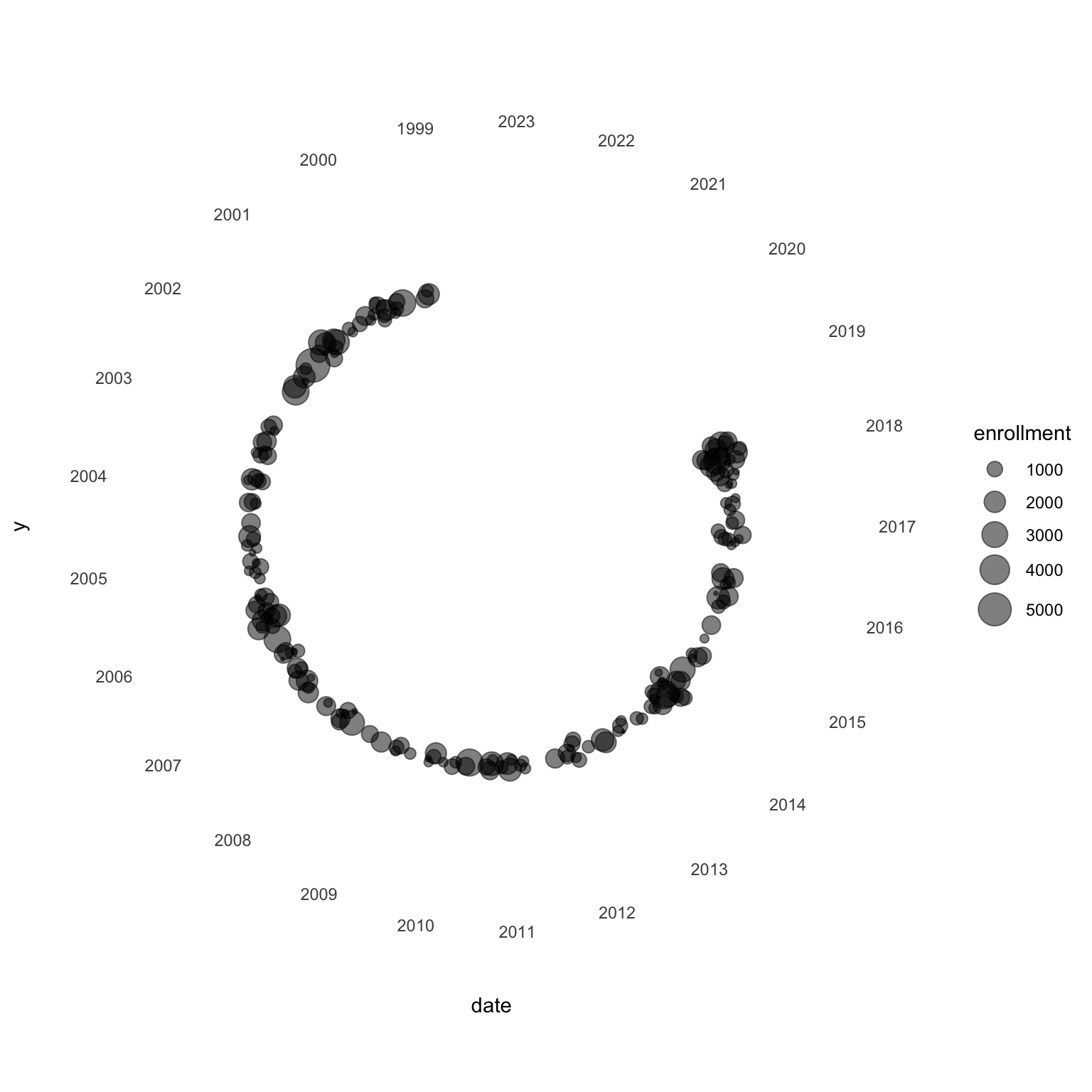 ggplot(data, aes(date, 0, size=enrollment)) +