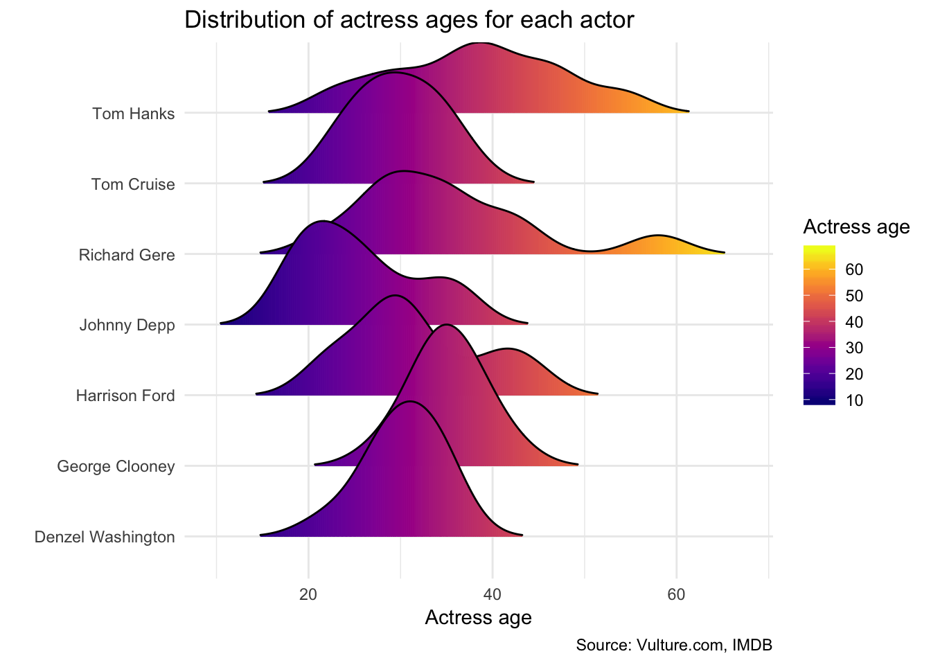 labs(title="Distribution of actress ages for each actor", y="", x="Actress age", caption="Source: Vulture.com, IMDB") +