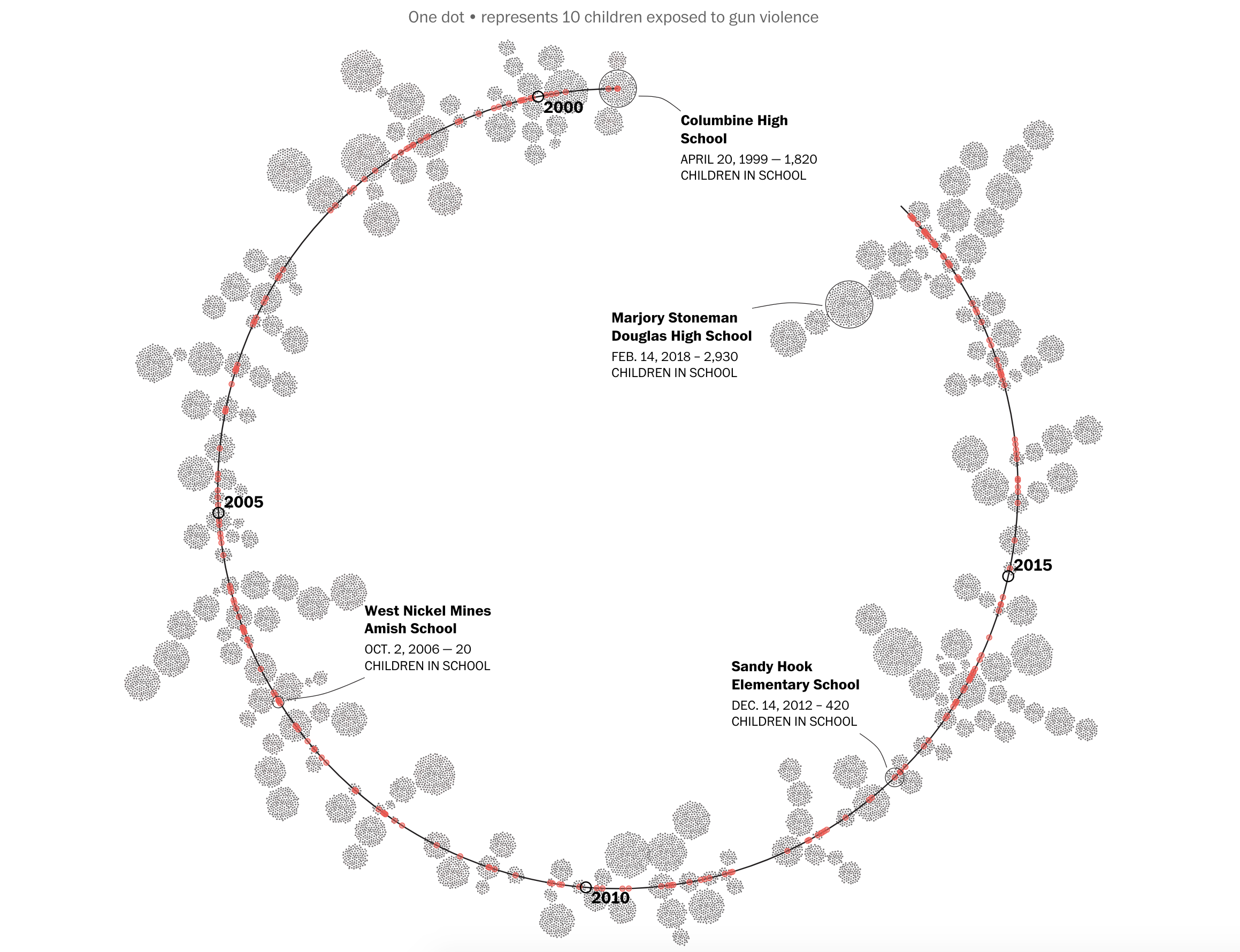 This visualization is by John Muyskens of the Washington Post. He created this exploratory graphic using school shootings data before refining it in D3 and publishing it. It should be noted that the final chart uses methodology to estimate attendance based on enrollment figures that differs from what is shown here.